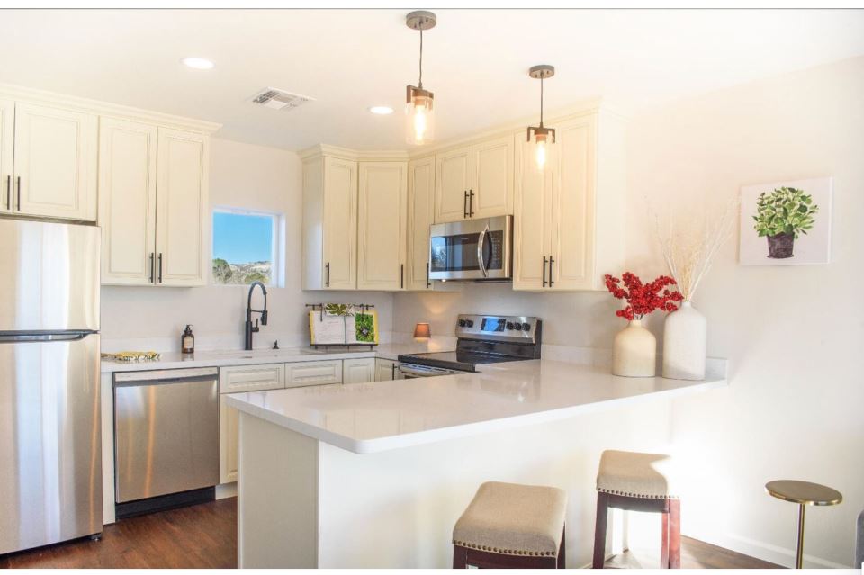 Each floorplan features a full-sized kitchen with an abundance of storage and cabinetspace, plus a 6-burner electric range, oven,dishwasher + refrigerator/freezer.